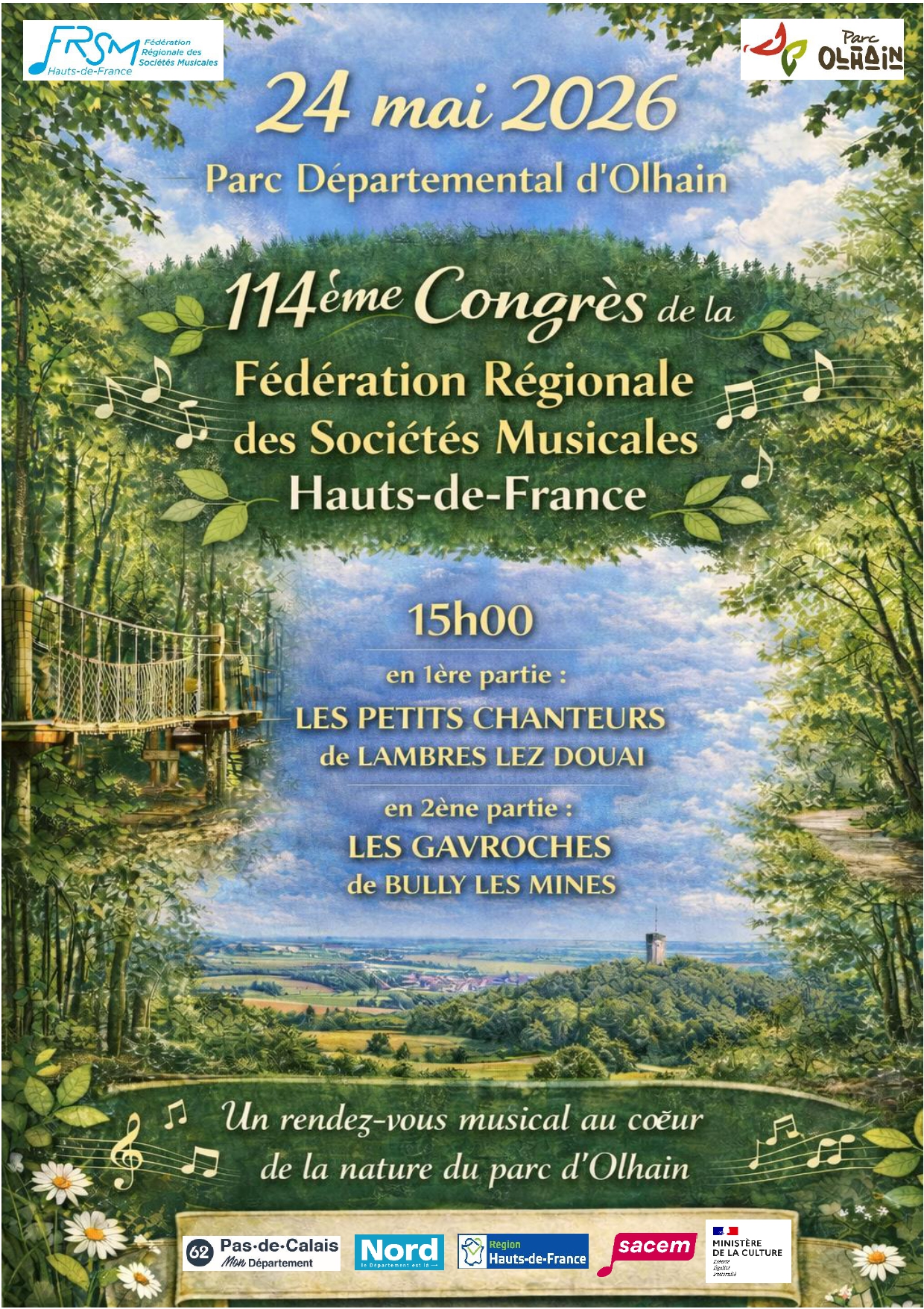 Le congrès de la Fédération Régionale des Sociétés Musicales Hauts-de-France se déroulera le dimanche 24 mai au sein du Parc Départemental d'Olhain, rue de Rebreuve à Maisnil les Ruitz dans le département du Pas-de-Calais.